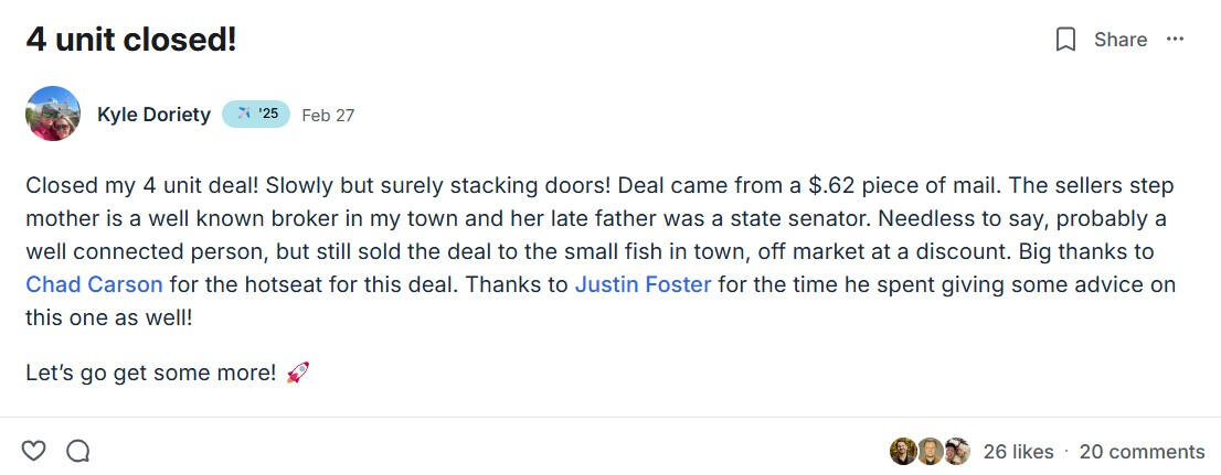 After you join, you'll be able to learn and get your questions answered on a regular basis so that you can make progress on your real estate deal-finding.